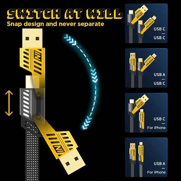 The 4-in-1 Multi USB PD Charging Cable is versatile and powerful, supporting Type-C to C, C to Lightning, USB to C, and USB to Lightning connections. It offers 65W fast charging, and 480Mbps data transfer, and features a durable, anti-tangle nylon braided design with zinc alloy construction for enhanced durability.